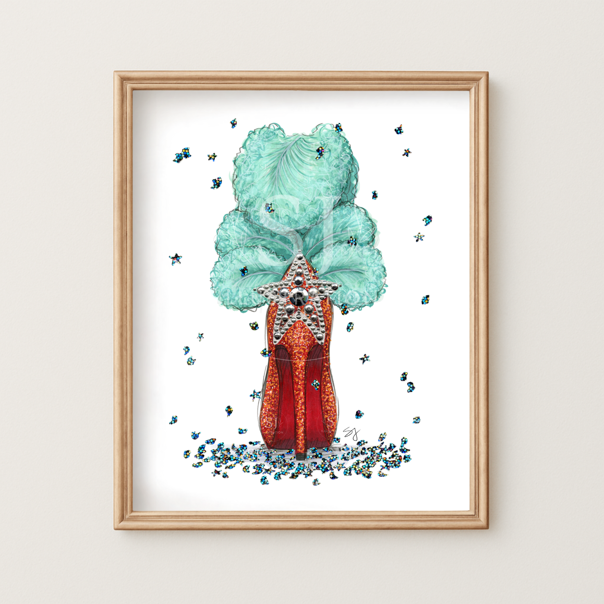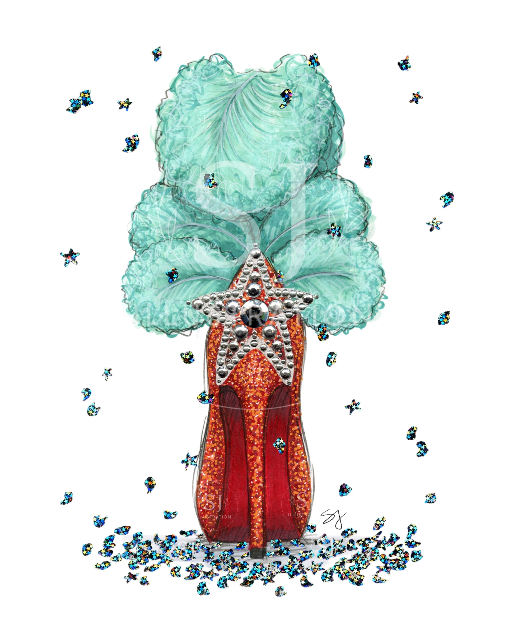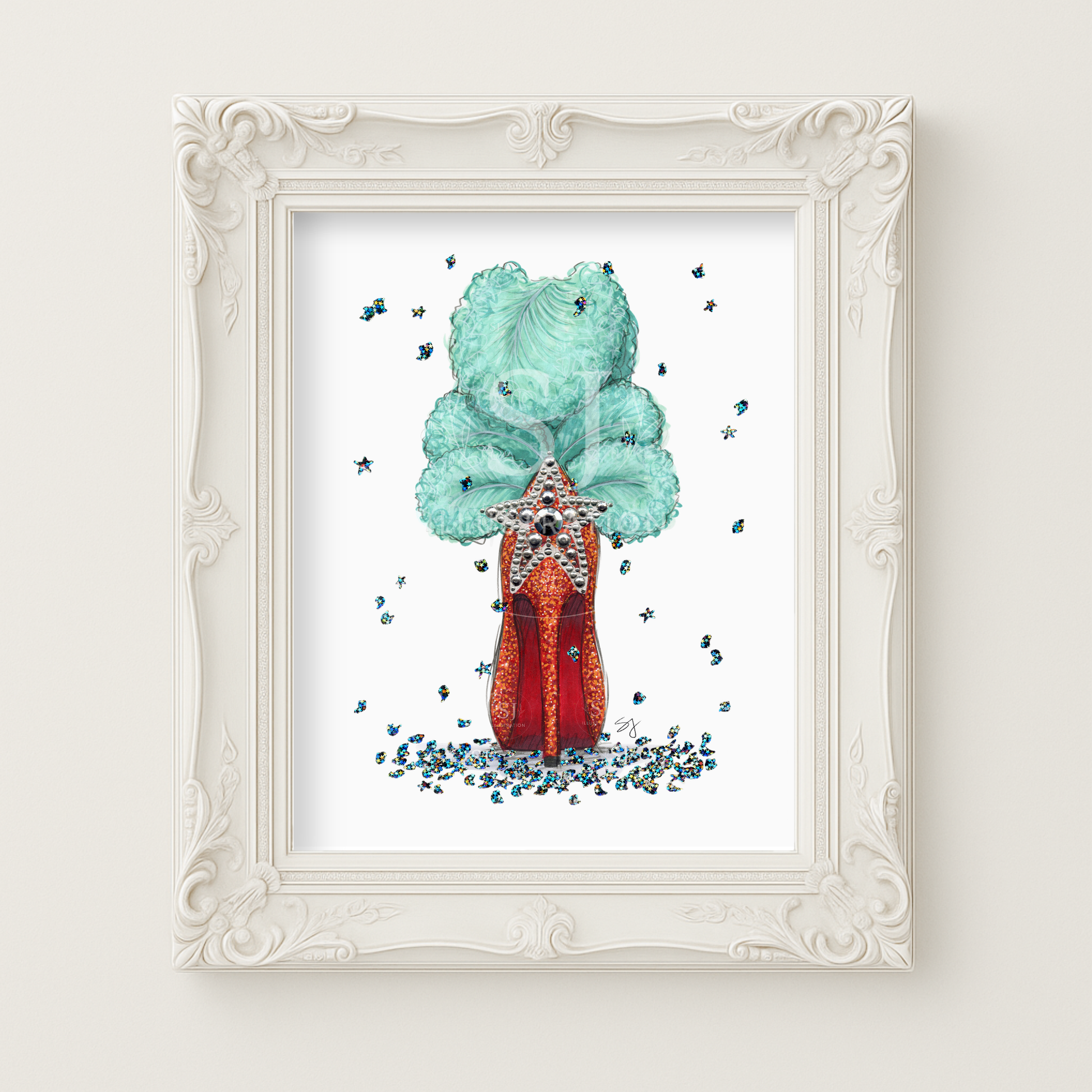- This item is an archival matte giclée print of an original hand-drawn illustration. Rhinestones and orange metallic embellishment are added to each individual print by hand upon order. Due to sizing of art and details, 5x7" prints may have less and/or different embellishment than larger sizes.